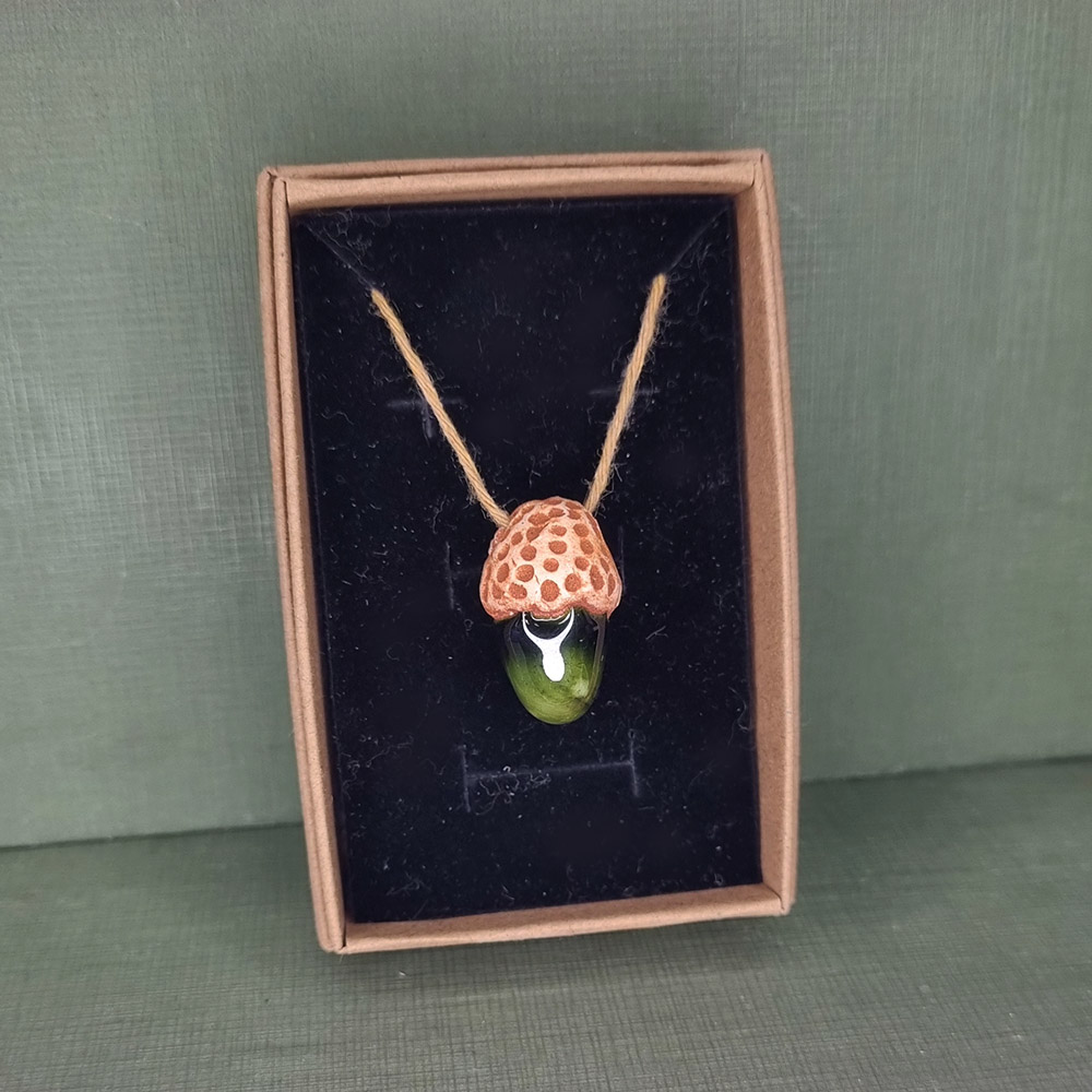 The Forest dragon pendant. A forest Green glazed Claycorn Pendant hung on a gold thread to be worn around the neck. The patterning happens to looks like a dragon on close inspection.